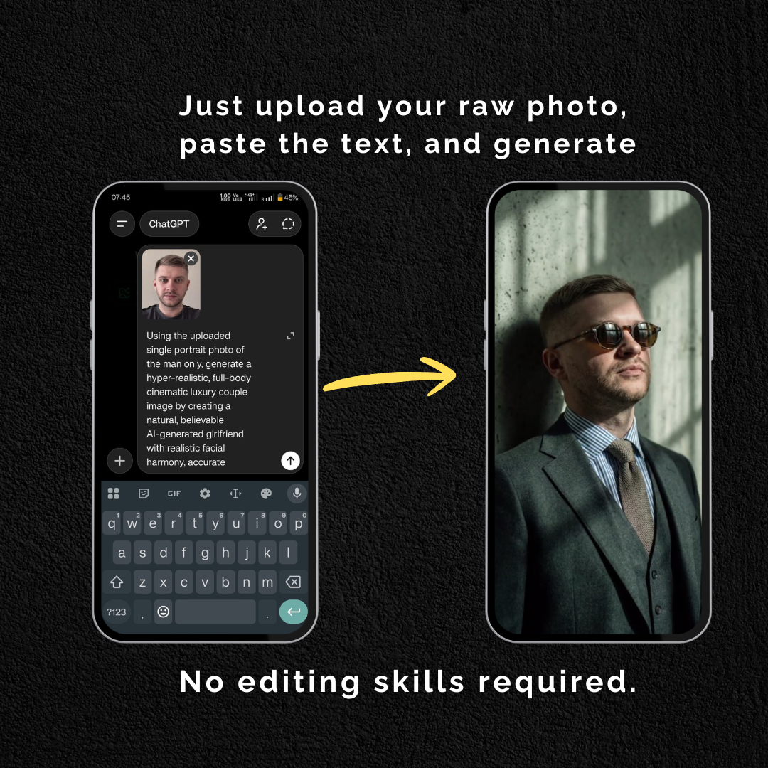 Upload your photo in ChatGPT or Google Gemini, then paste the ready-made image text provided to generate stunning images you never imagined.